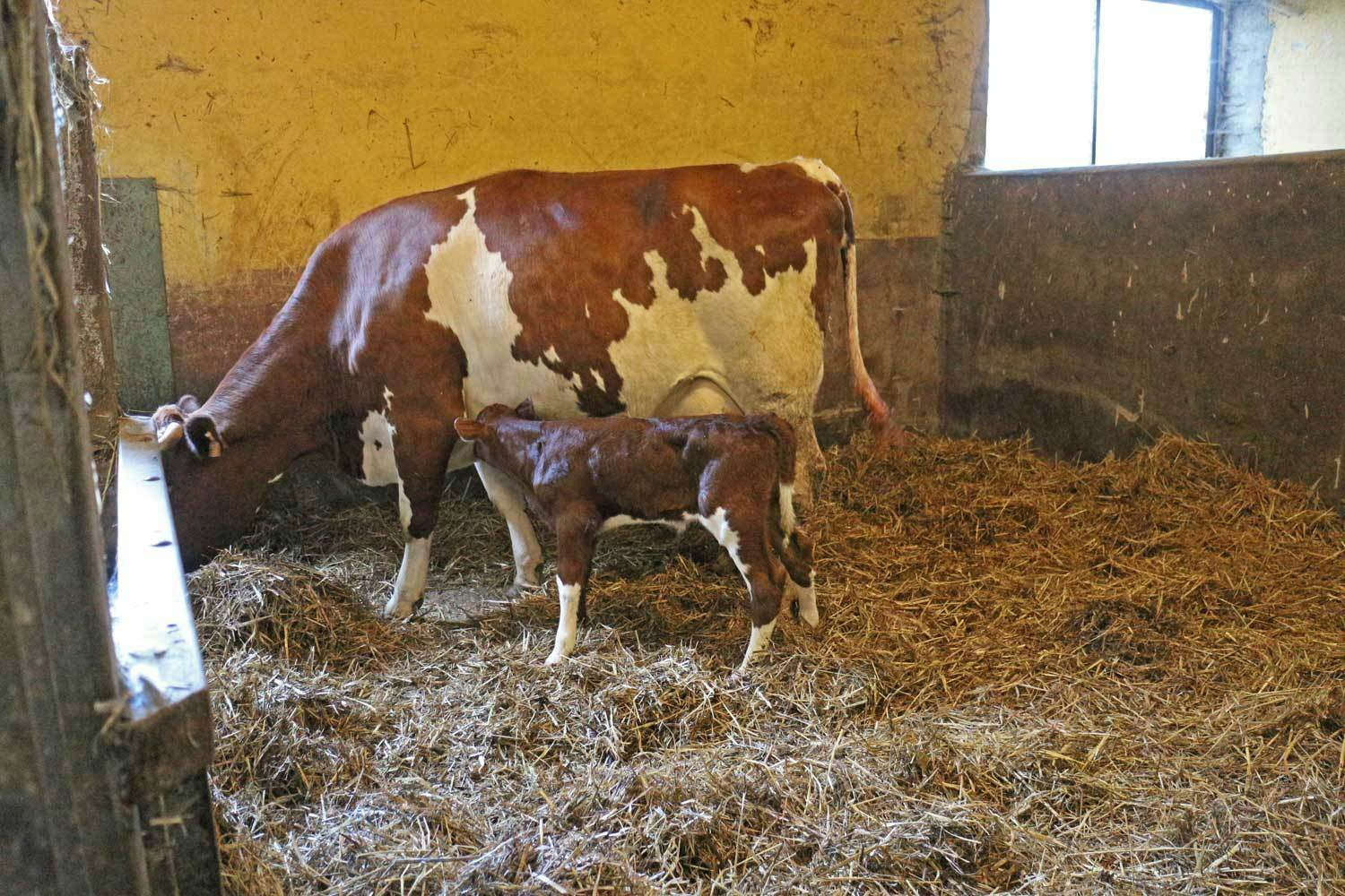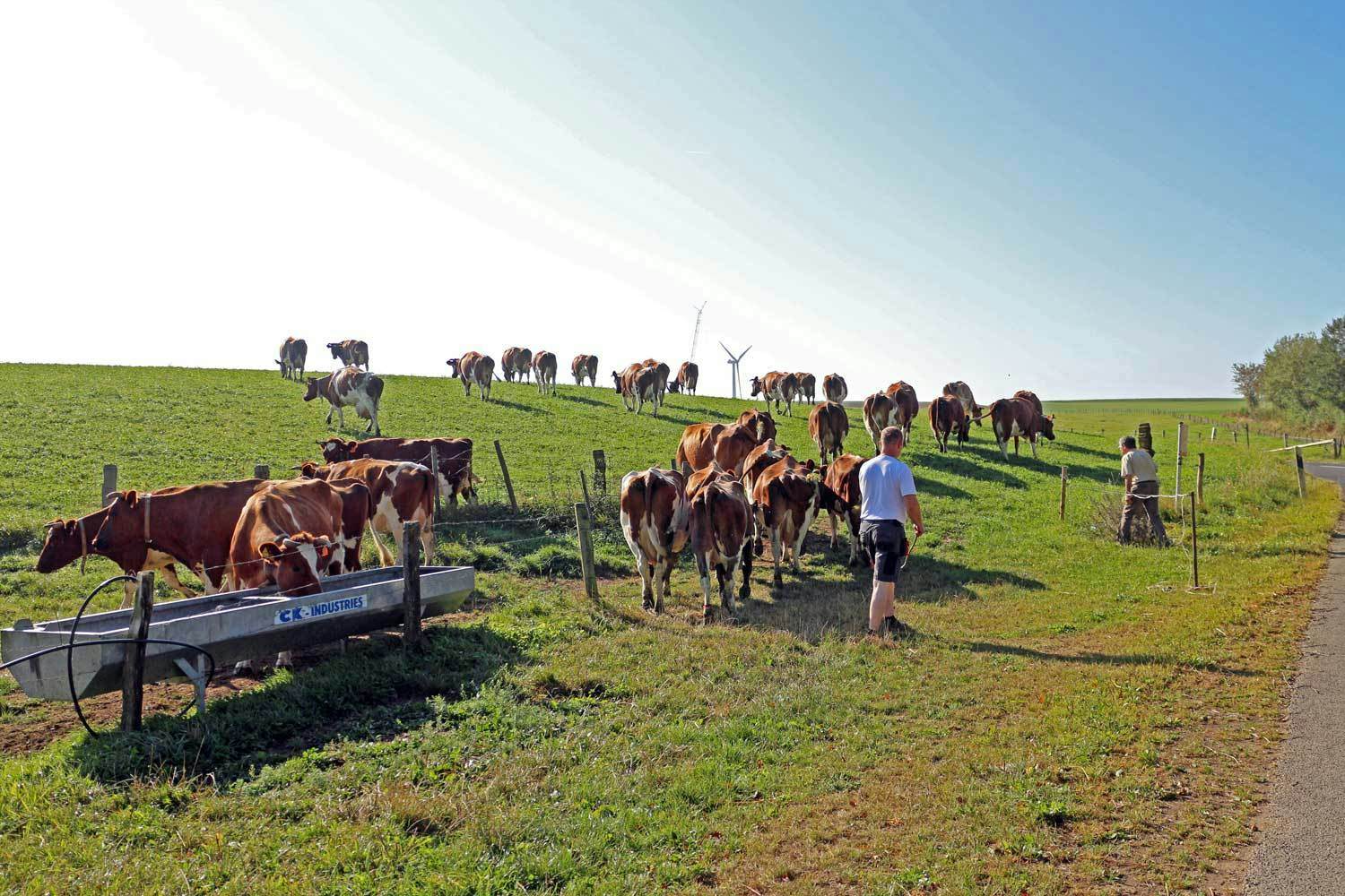 Auf dem Hof werden die Kühe in ihrer Anatomie und Stellung als Haustiere vom Betrieb verstanden. Für Jos Schanck ist die Milchkuh das nützlichste Tier im Landbau, denn mithilfe des sorgsam behandelten Kuh-Düngers werden die Wiesen schön saftig und die Ackerfrüchte üppig. Dabei wird besonders auf die Fütterung und Haltung der Tiere geachtet, um auch gesunde Milch zu erhalten. Insgesamt gibt es 40 Kühe mit Nachzucht und Zuchtbulle, die eine einheitliche Herde mit Hörnern bilden. Das Milchvieh wird an den Hof und dessen Struktur angepasst und das selbstangebaute Raufutter wird bestmöglich als Heu verwertet. Die Tiere haben im Winter einen weitläufigen Boxenlaufstall mit Stroheinstreu zur Verfügung und weiden im Sommer auf dem Grünland. Die Milch wird zum größten Teil in der BIOG-Hofkäserei zu Öslinger Käse verarbeitet. Die Käsesorten sind z.B. „Haarden“, „Natur“, „Deelentramt“, „Paprika“, „Knuewelek“, „Peffer“ und „Moschter“. Durch die handwerkliche Produktion werden die Endprodukte individuell im Geschmack und Aussehen.
